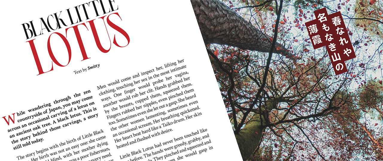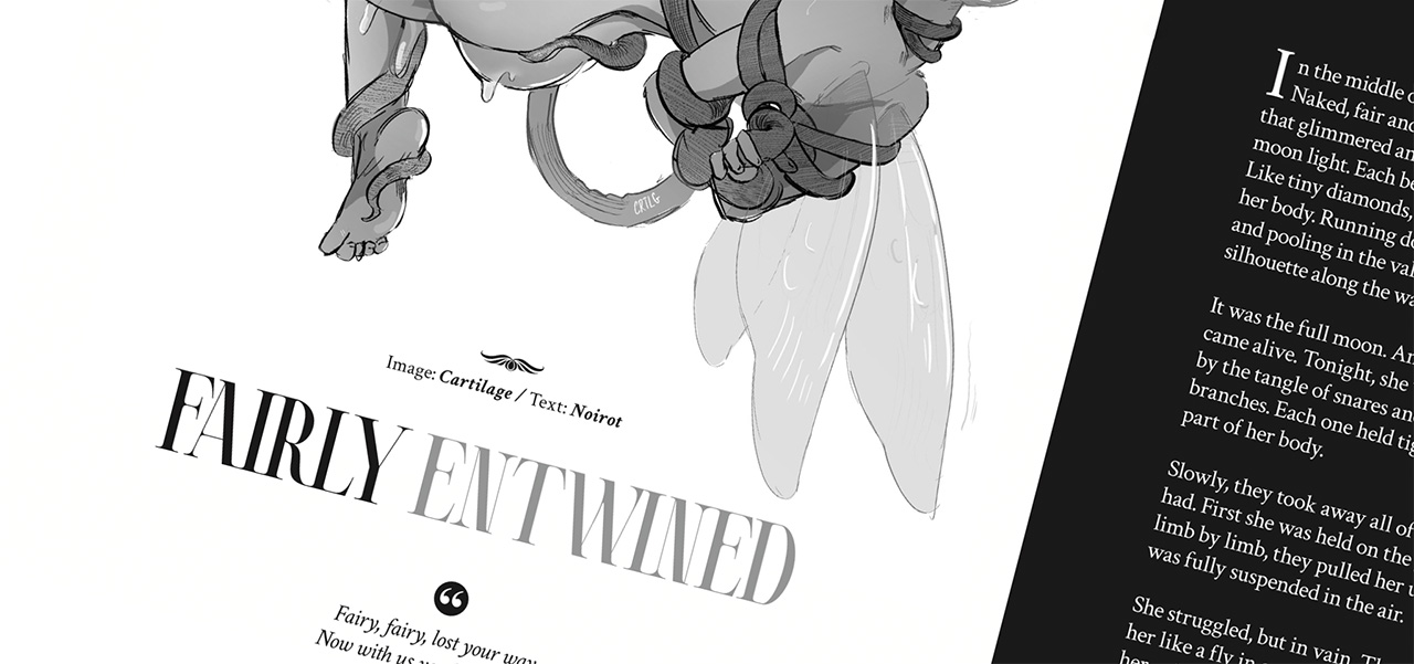 We dedicated our research for this issue to the myths and fairy tales that feed our phantasies and inspire our tying. When we reach out in Kinbaku, beyond petty techniques and pretty pictures – where do we go? Our answer is to dive into the endless ocean of our own fantasy, to get lost in the forest of fiction, and to inquire about our dark desires.