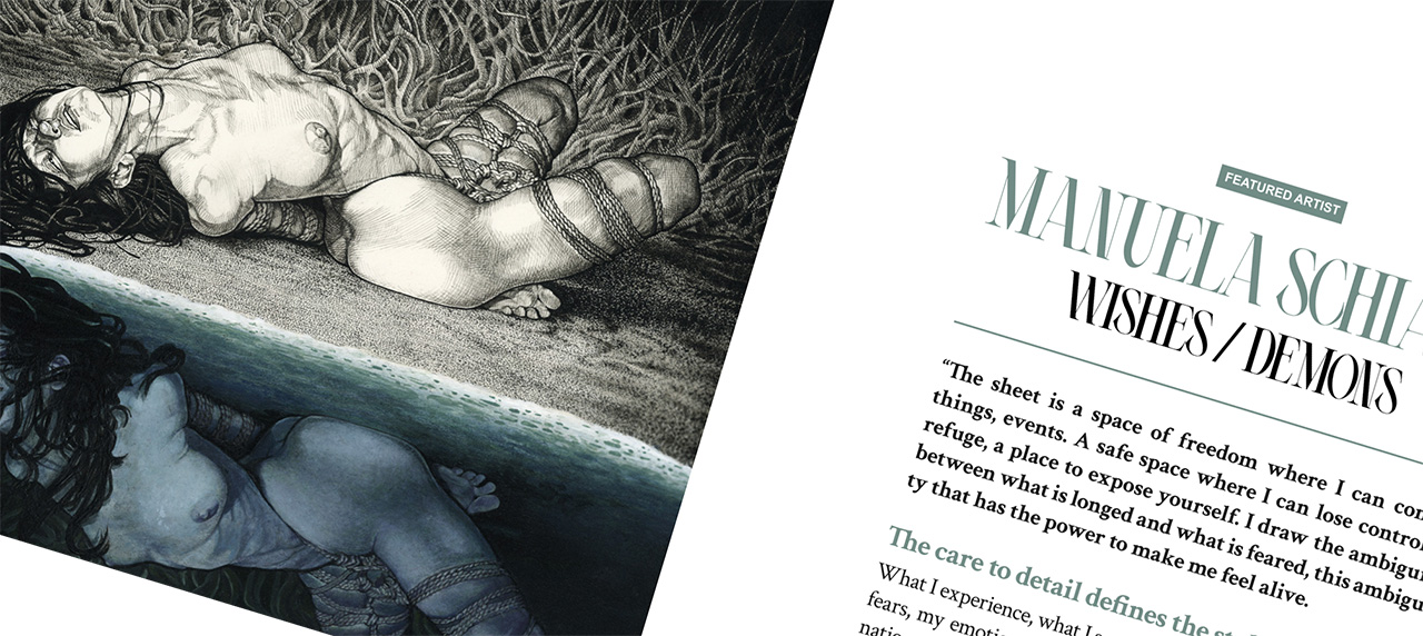 So, into the darkness we go. The leaves fell, bare stand the trees. Fog rolls in. Follow me, indulge in the details of the hand-drawn graphics of Manuela Schiano, our featured artist, learn about the fairies in East and West – and about the transmutations of sexual identity in the History of Eroguro. See what I desire – there are not only ropes, there are sharp blades, skillfully crafted.